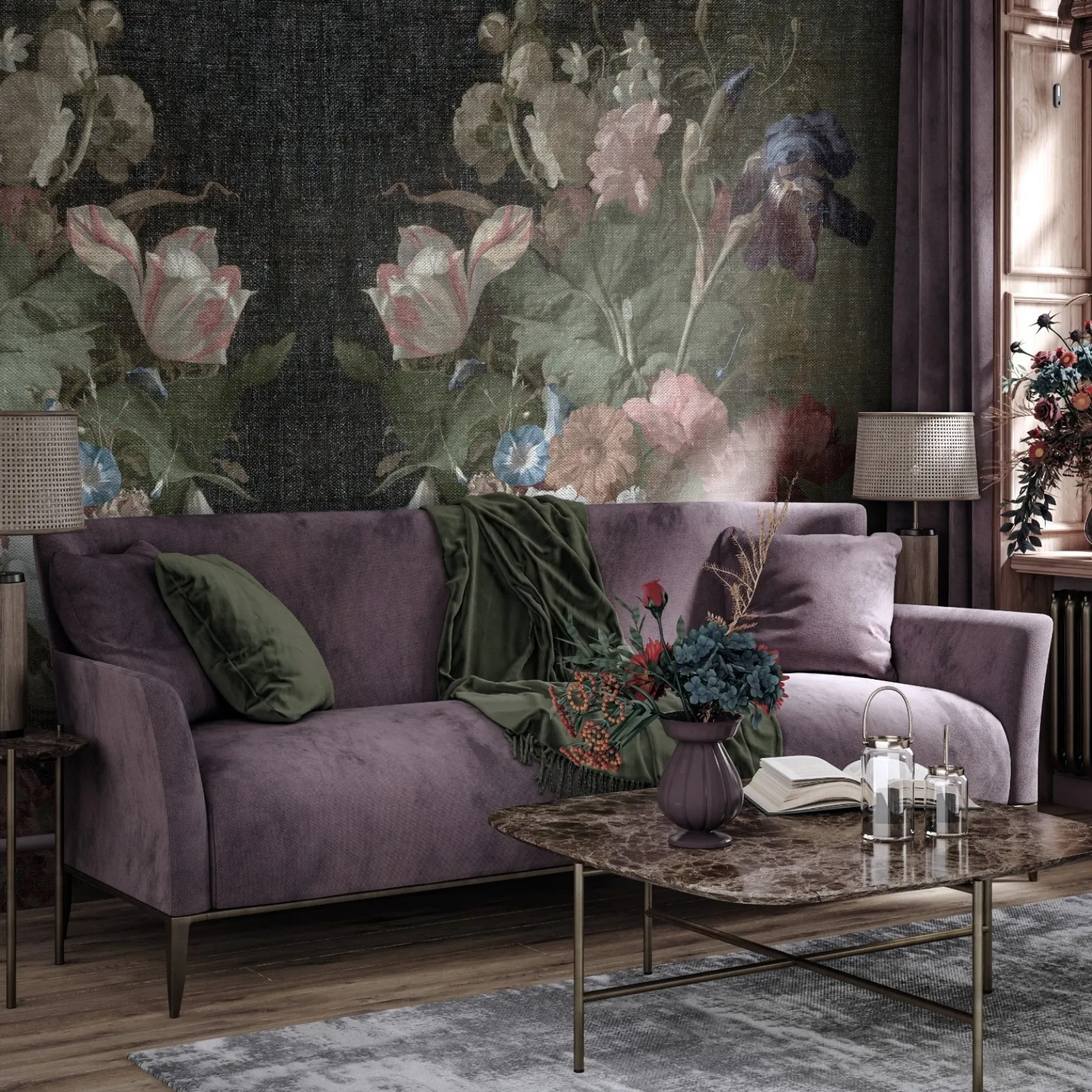 Con gli Accessori Casa dell'azienda potrai toccare con mano le più belle composizioni, frutto di pluriennale competenza nell'arredo di un'atmosfera classica come quella nell'immagine. Una grande varietà di Carta da parati vinilica ti aspetta nel nostro sito per ogni tipo di stanza e di esigenze. La Carta da parati Dark Bloom di Pintdecor qui presente è pensata per ultimare il tuo concept d’arredo con un ottimo effetto estetico, una volta applicata ai muri.