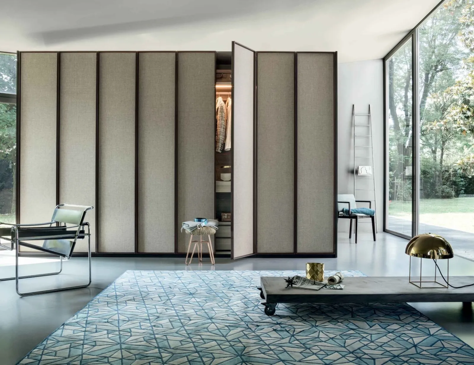 Cabine e armadiature a muro sottolineano lo stile e le doti di praticità della camera da letto, infatti è essenziale valutare attentamente, misure, linee e abbinamenti, sia cromatici che stilistici. Tra i diversi modelli moderni dei migliori produttori di Arredamento Casa, potrai trovare anche l’armadio in materico visibile in foto: arredi realizzati con materiali pregiati e capaci di assicurare un design unico e tanto spazio per indumenti e quant'altro. Armadio con ante battenti rivestite in tessuto Dandy di Lema: arreda la tua camera da letto con componibilità personalizzabile e le doti contenitive tipiche dei prodotti con ante battenti del noto e conosciuto marchio.