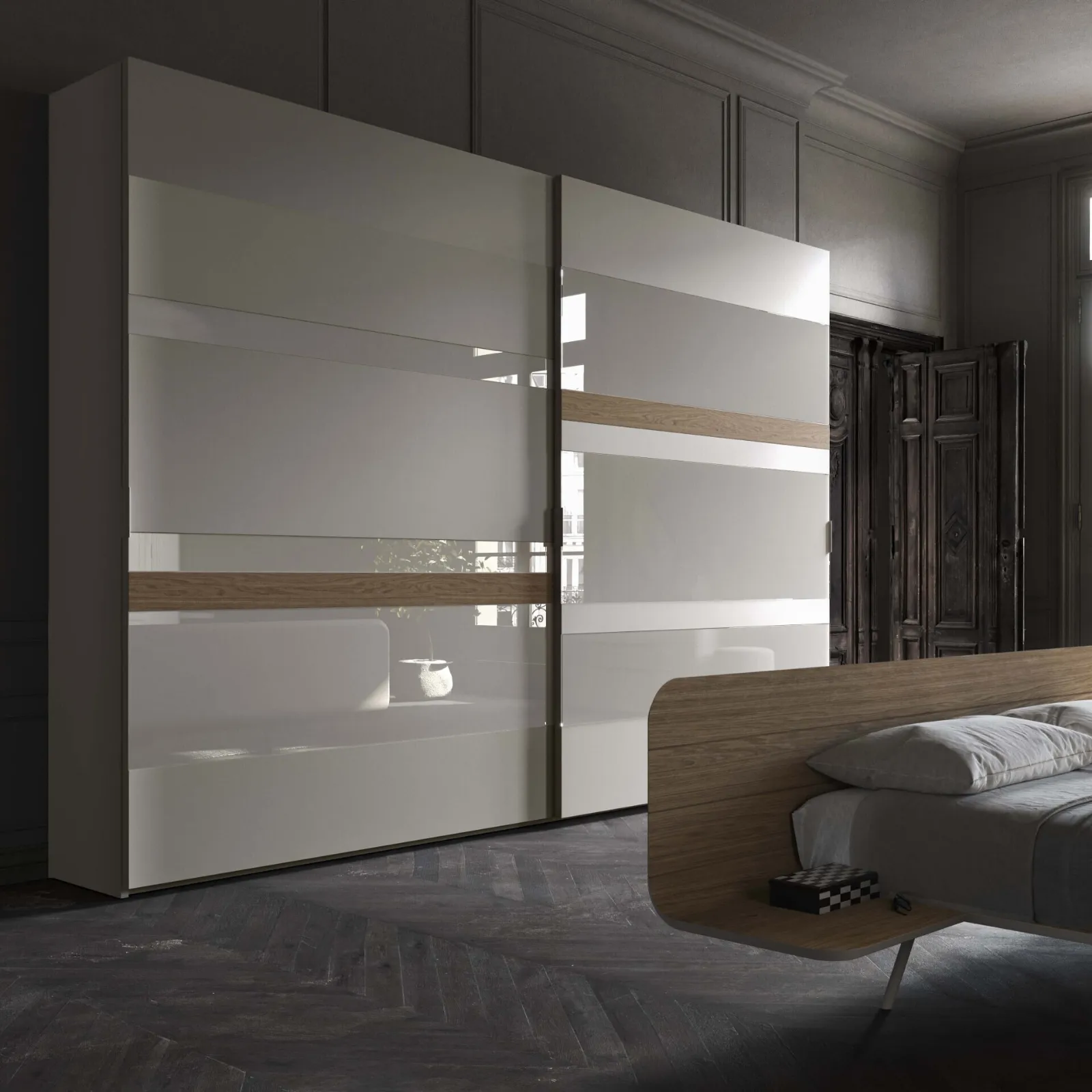 Armadio con ante scorrevoli Elite Vetro fasce Legno di Voltan: l'eccellenza nell'arredamento moderno.