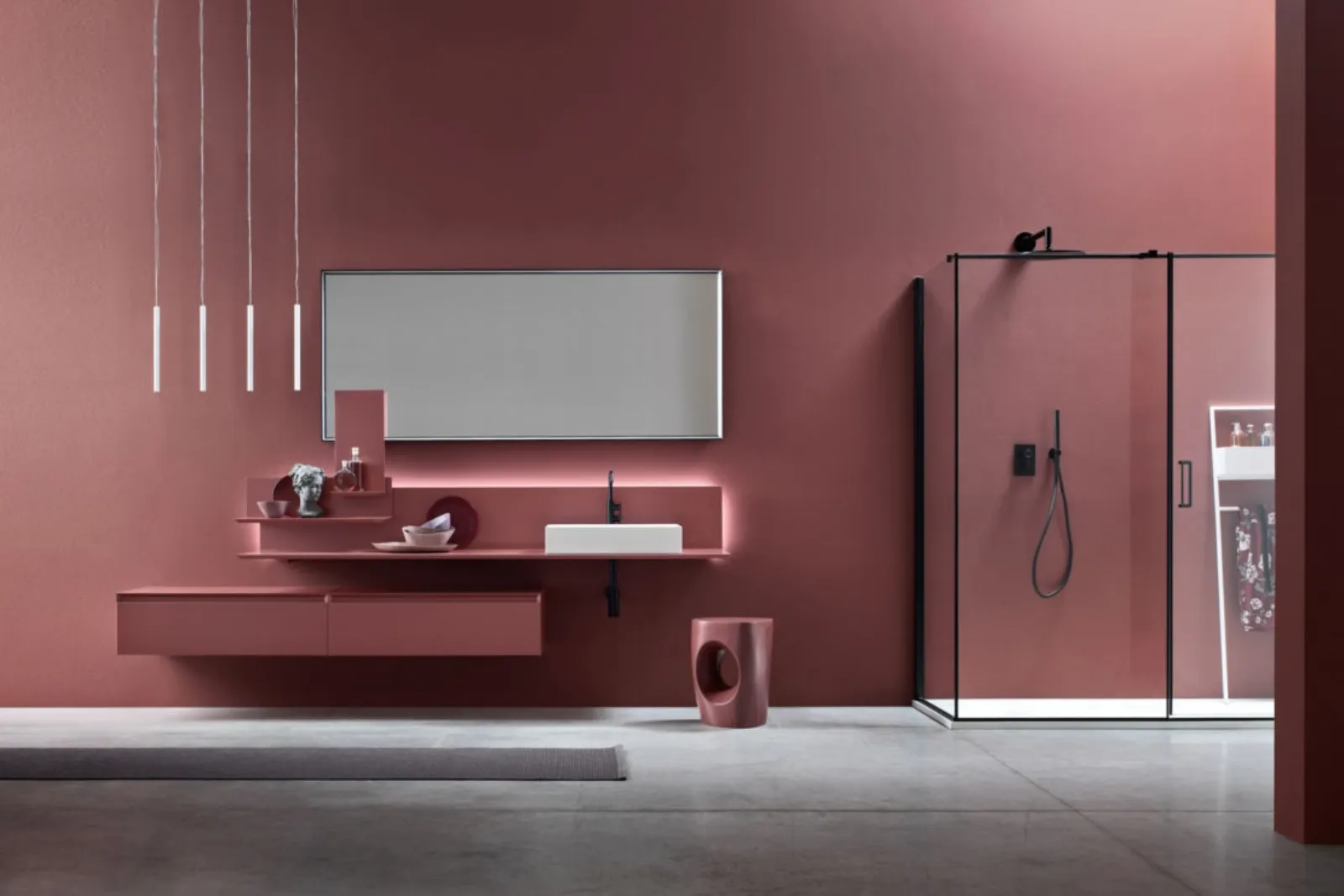 Scopri il design Dafne 01 di Arcom: un showroom di mobili bagno sospesi in laccato opaco per valorizzare l'arredo bagno di casa.
