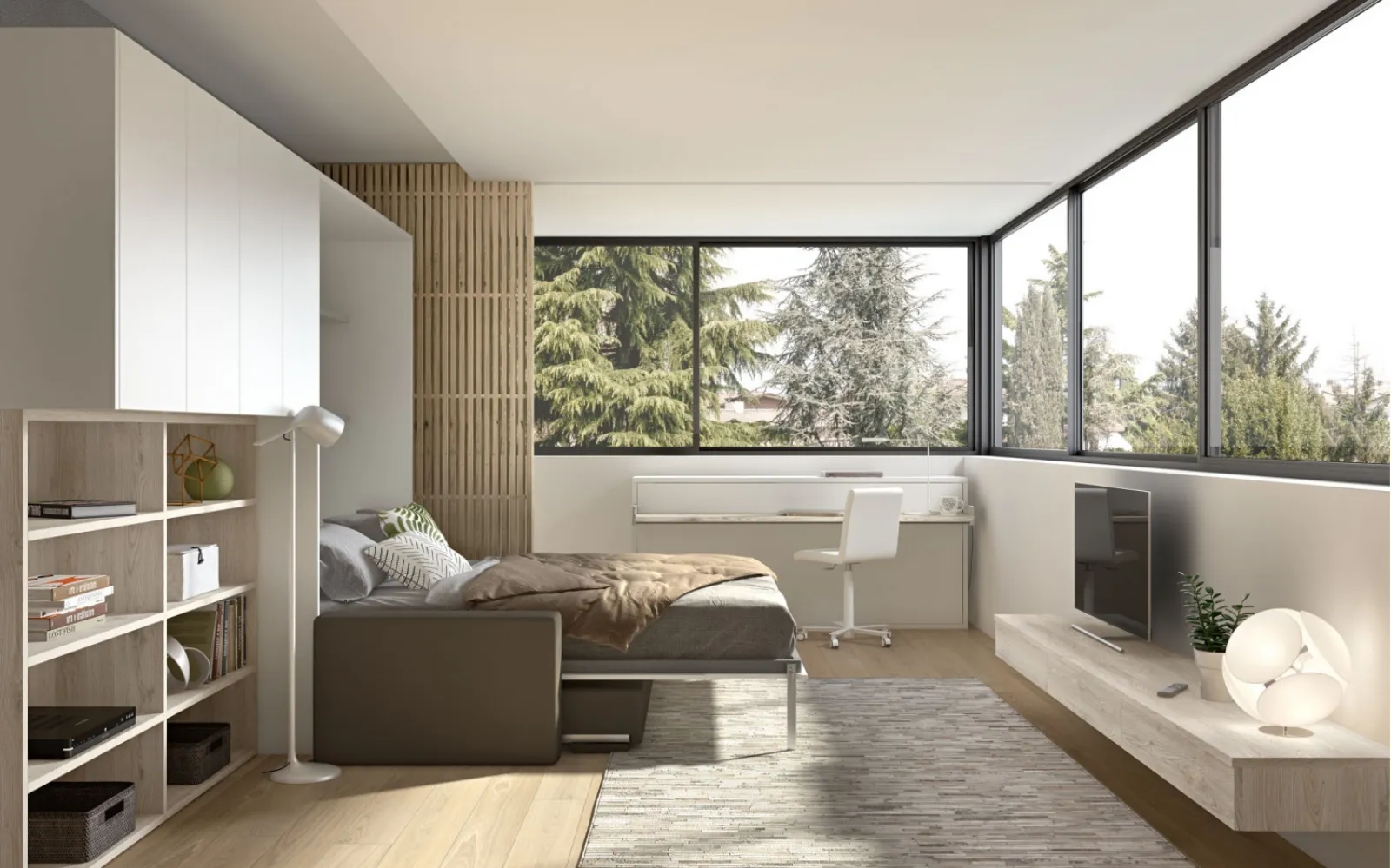 Room148 di Zg Mobili è una camera salvaspazio che unisce ergonomia e sicurezza, linee decise e tonalità vivaci, ottimizzando ogni spazio.