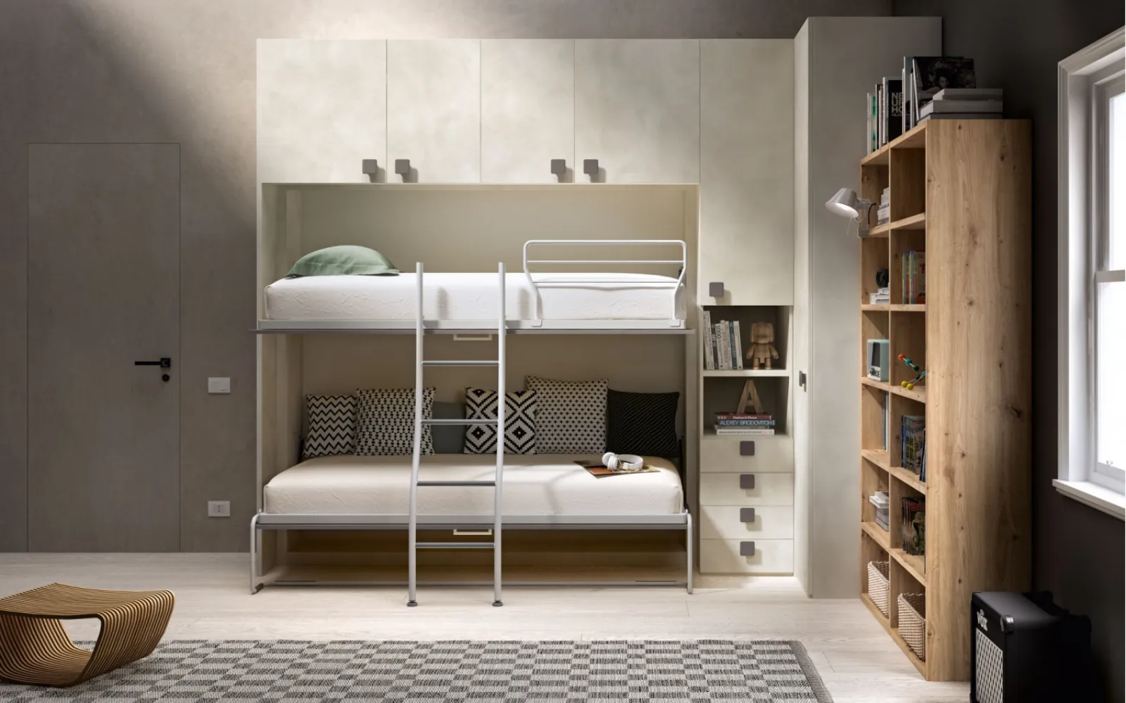 Nel nostro portale di mobili e oggetti accessori per la cameretta potrai trovare molteplici soluzioni moderne per completare al meglio lo spazio dove i tuoi figli avranno la possibilità di diventare grandi e sognare per anni. Scopri nel nostro portale una ricca gamma di Camerette salvaspazio delle migliori marche: non possono mancare soluzioni ideali per soddisfare le esigenze degli adulti e i gusti dei bambini. La Camera salvaspazio Room152 di Zg Mobili qui visibile è una tra le più originali soluzioni per ragazzi in commercio. Questa cameretta, realizzata dal brand specialista del settore Arredamento Casa, è una soluzione salvaspazio in laccato opaco, solida, accogliente e vivace. Caratteristiche principali della Camera salvaspazio Room152 di Zg Mobili: