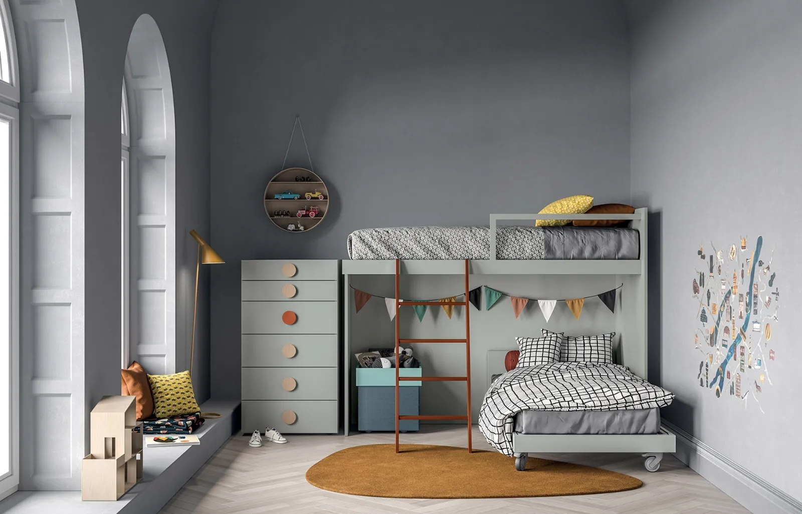 I nostri professionisti d'arredo ti attendono per supportarti nell'arredo della stanza dei tuoi figli con le più originali composizioni arredative moderne in melaminico, dove diventare grandi e giocare per anni. Se desideri avere info e preventivi sulla Cameretta con Letti a Castello di Erba qui presente, contatta i nostri professionisti d'arredo. La cameretta è il luogo in cui i nostri figli cresceranno giocando e sognando: dev’essere uno spazio ben organizzato ma dallo stile vivace. I più piccoli passano molte ore delle loro giornate nelle loro stanze, per studiare, divertirsi e riposare, perciò il brand ha studiato un ricco catalogo di soluzioni per bambine con letti a castello.