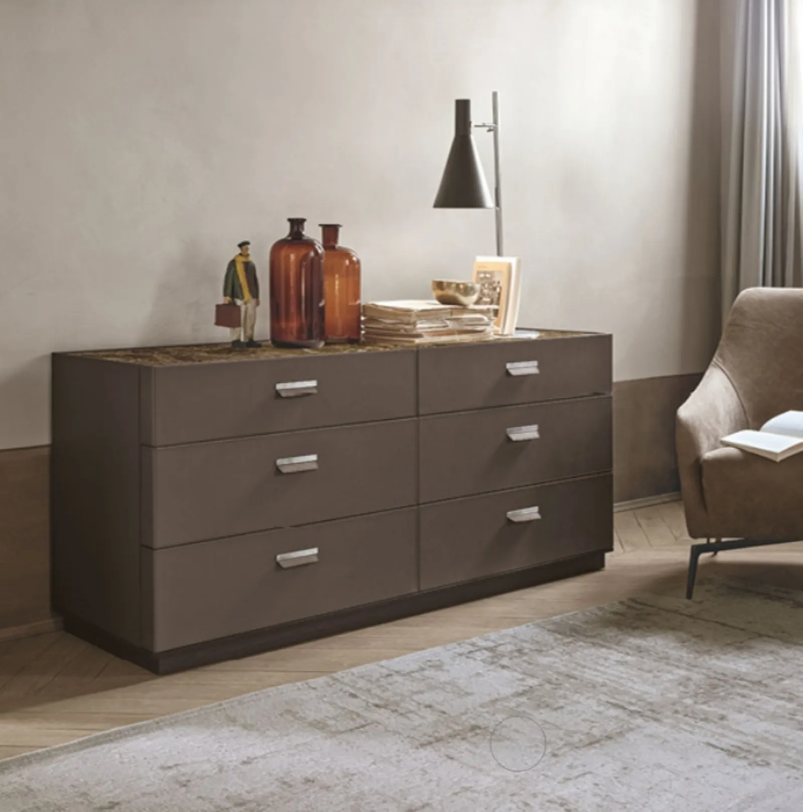 Comò Skin di Alivar è un mobile contenitivo poliedrico, in grado di garantire praticità e un'ottima resa estetica in una camera dai richiami moderni. Le sue caratteristiche principali sono: