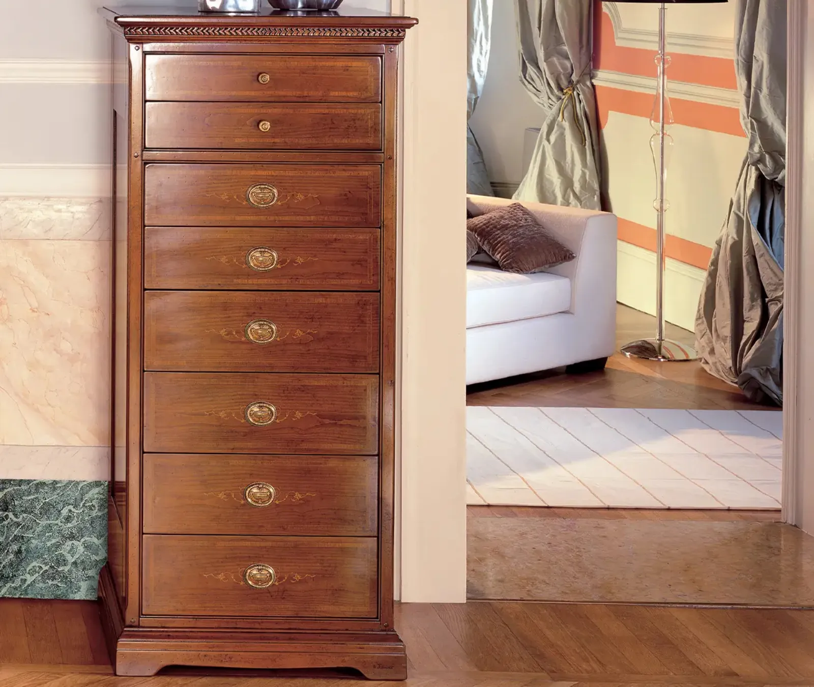 Scopri un'ampia gamma di Comodini classici del marchio, leader nella produzione di mobili e complementi per la camera, e ottimizza i tuoi locali garantendoti grande funzionalità, spazio contenitivo e un design unico. I Comodini, comò e settimini possono essere coordinati al letto e all'armadio oppure possono essere in equilibrato contrasto con essi: è necessario che siano slezionati seguendo le reali possibilità di spazio e cercando di creare un armonioso concept d’arredo. Cassettiera Dalia di Le Fablier: contattaci per info e preventivi su questo mobile contenitore in legno.