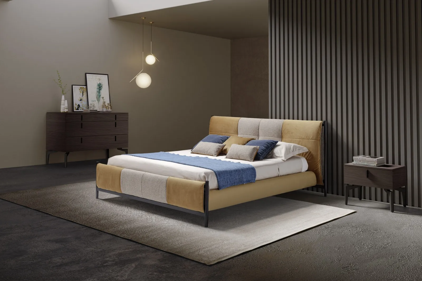 Per allestire perfettamente la camera da letto è di primaria importanza valutare gli abbinamenti con armadi e comodini, elementi accessori e quant'altro: se vuoi mobili moderni, il modello nell'immagine fa per te. Naviga il nostro sito di Arredamento Casa e valorizza la tua camera con i Letti matrimoniali imbottiti dei migliori produttori. Il Letto in tessuto Aurelia di Novaluna è uno dei prodotti più inediti del brand, garanzia di durata negli anni, qualità dei materiali e stile.