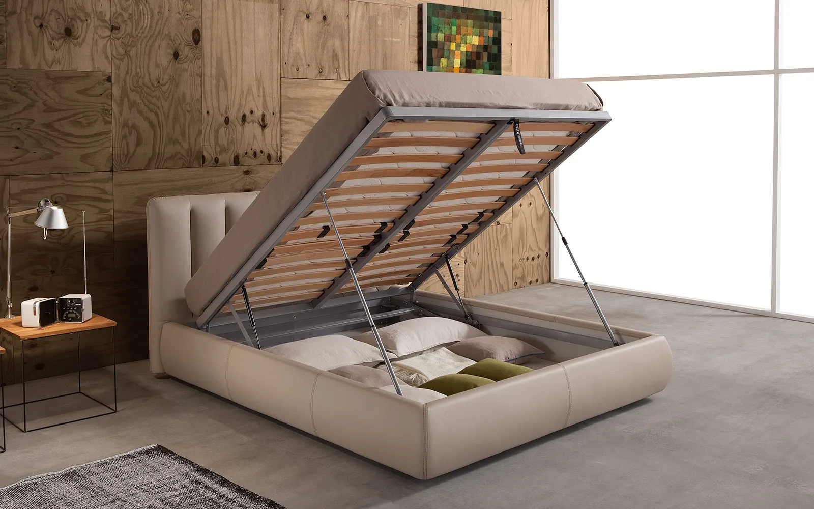 Il letto matrimoniale con contenitore si abbina perfettamente a mobili e complementi d'arredo di ogni genere, come armadi, comodini, lampade e piantane. Potrai scegliere tra una vasta gamma di tonalità e finiture e creare il tuo concept d'arredo nella zona notte.
