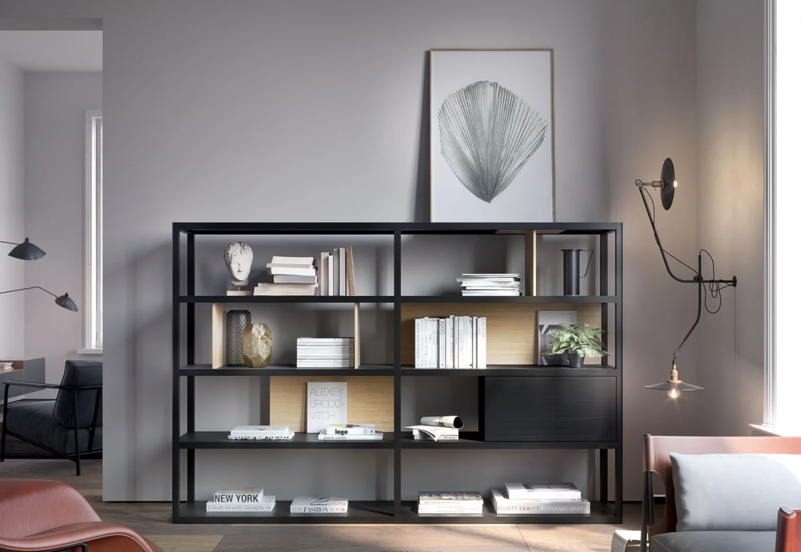 Le Librerie a muro sono una soluzione funzionale e versatile per completare il tuo arredamento casa. La firma Treku propone vari modelli di librerie angolari, lineari, sospese e realizzabili su misura con diversi elementi, mensole e vani. La Libreria Kai, presente nella fotografia, è disponibile nella finitura Light Oak e Kai Black ed è estremamente solida e durevole.