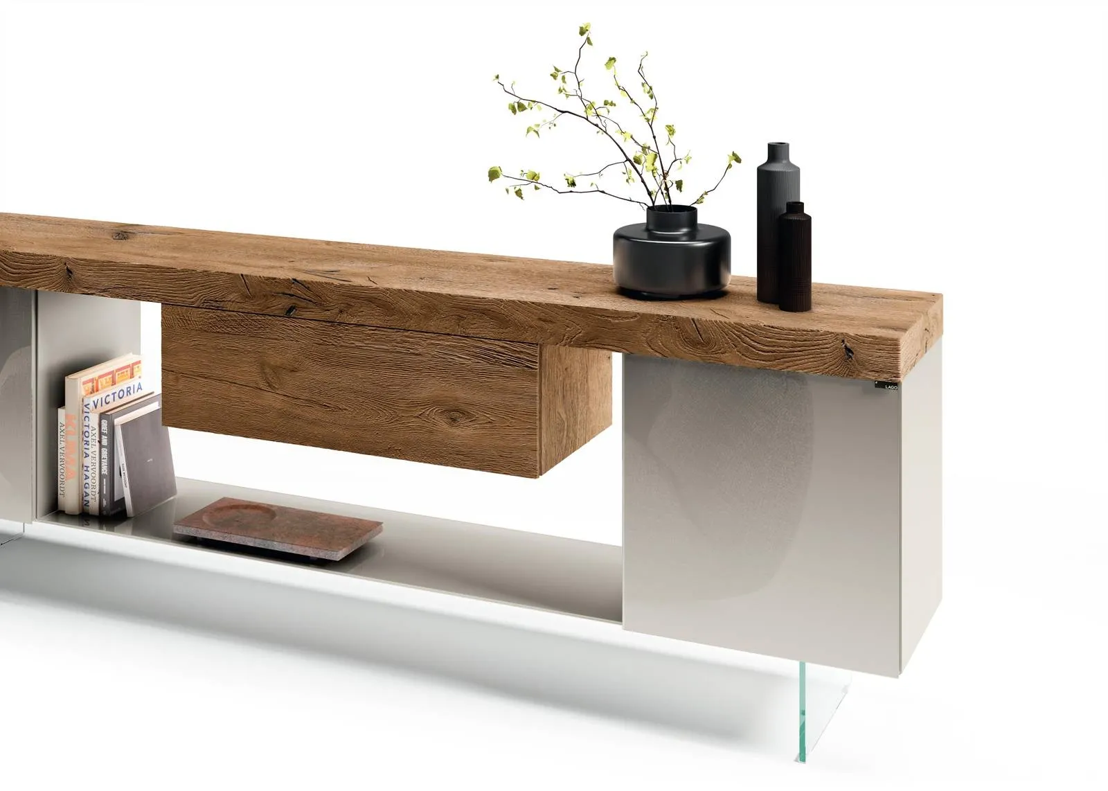 Contatta gli esperti di Arredamento Casa e dai vita a un'ambientazione assai funzionale e raffinata con mobili e oggetti accessori per la zona giorno anche realizzabili su misura. Una madia del genere ottimizza in modo strategico i tuoi interni valorizzandoli appieno. Scopri la nostra linea di Madie in vetro del noto e rinomato marchio, come il modello nella fotografia, e potrai ricreare un living pratico e operativo secondo le tue necessità e gusti. Carattere accattivante e un design unico conquisteranno anche te: la Madia in vetro e legno 36e8 2107 di Lago è una delle soluzioni più originali in commercio.