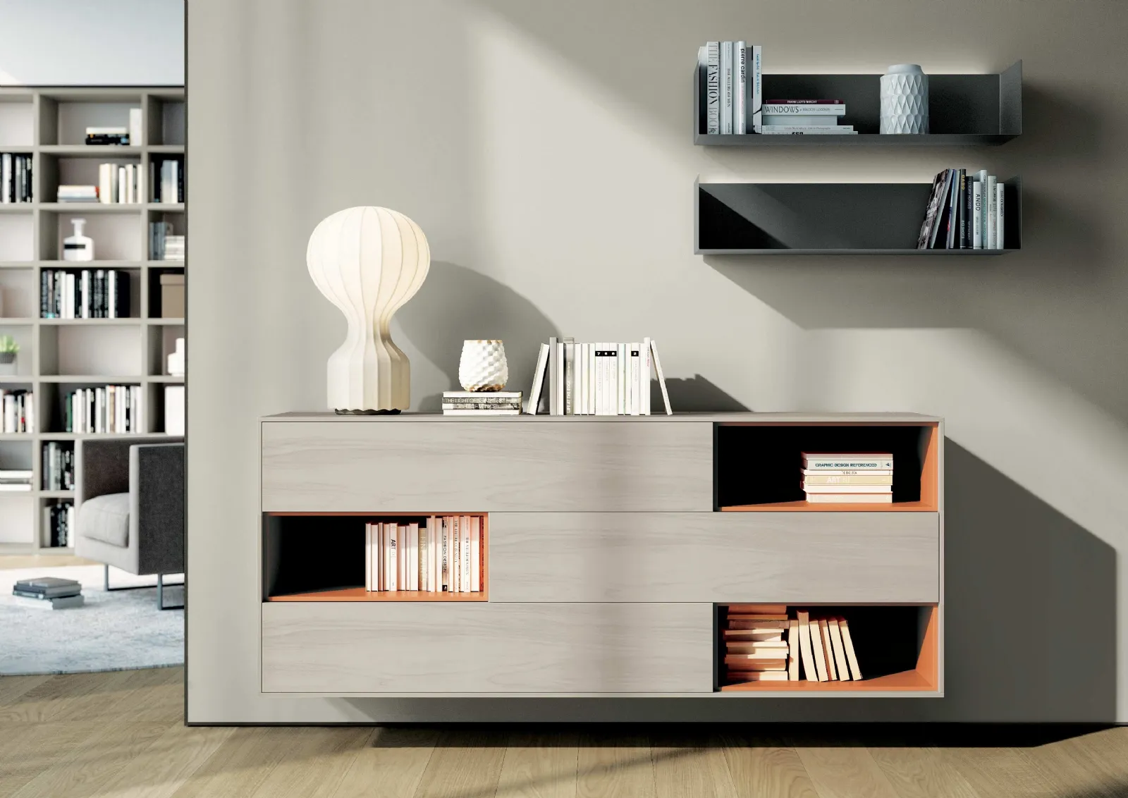 Madia sospesa Regolo di Spagnol Mobili: ideale per un living operativo e pratico, realizzata in melaminico per arredare la tua casa.