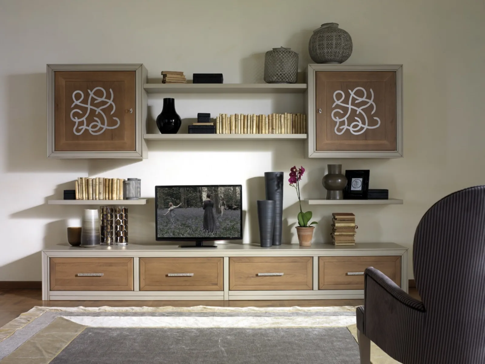 - Presenta un ricco catalogo di pareti attrezzate classiche, con componibilità su misura