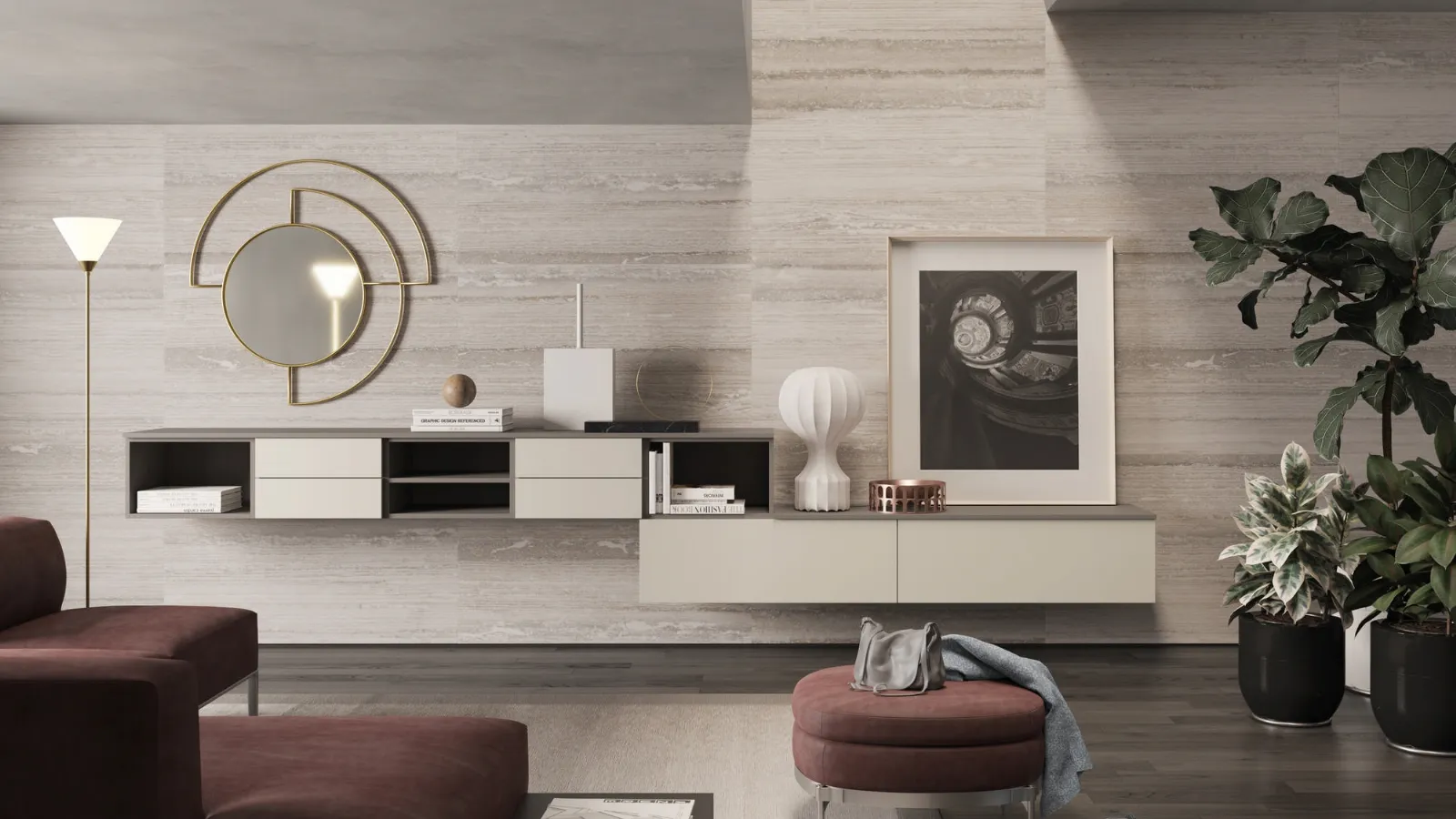 Parete Attrezzata sospesa Living 620 di Ime Arredamenti nell'immagine è una delle più originali soluzioni d’arredo sul mercato: