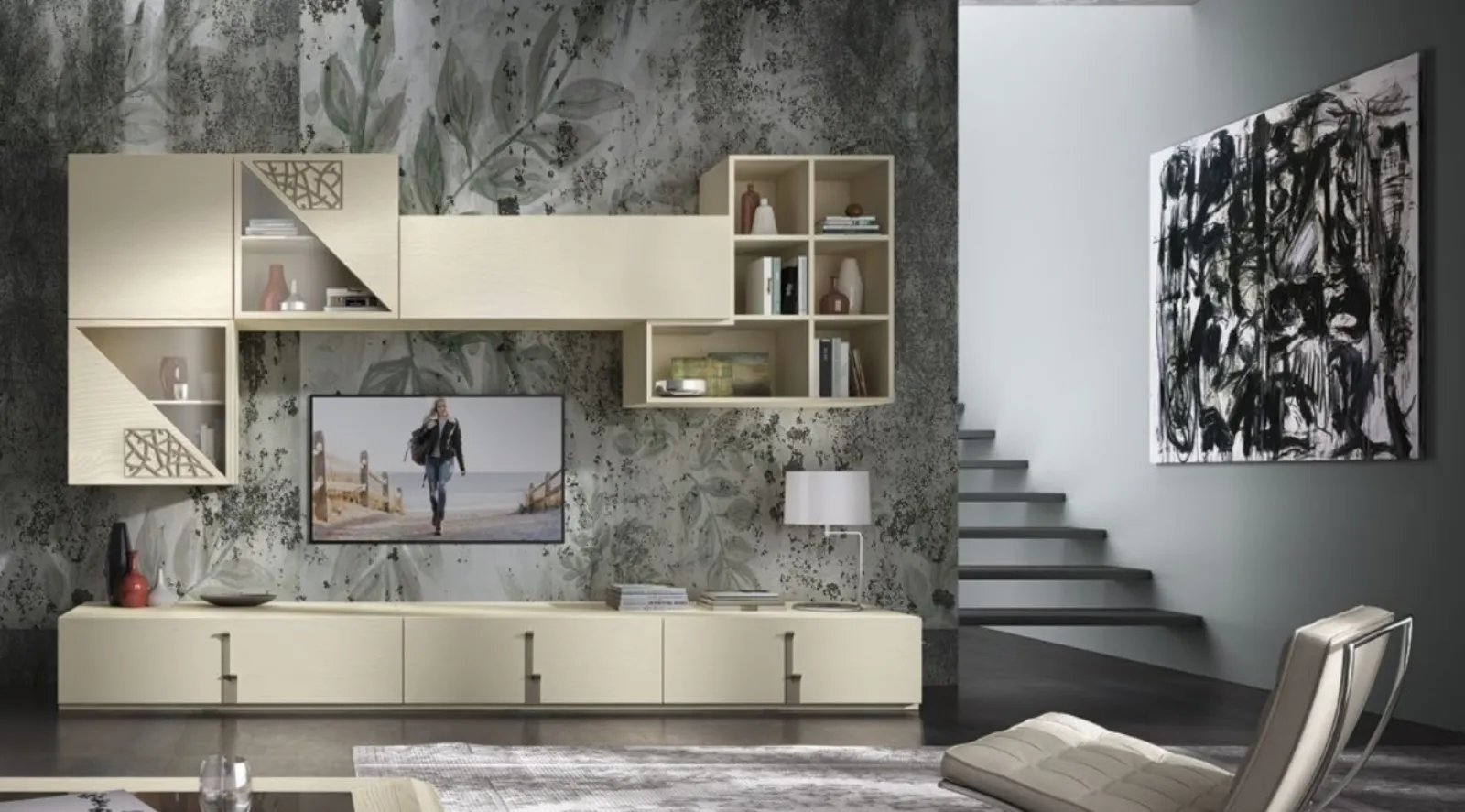 La Parete Attrezzata Manhattan art 6024 finitura Bianco Stil e dettagli Creta di Padovani Mobili diventa presenza caratterizzante in stanze di ogni tipo grazie ai suoi: