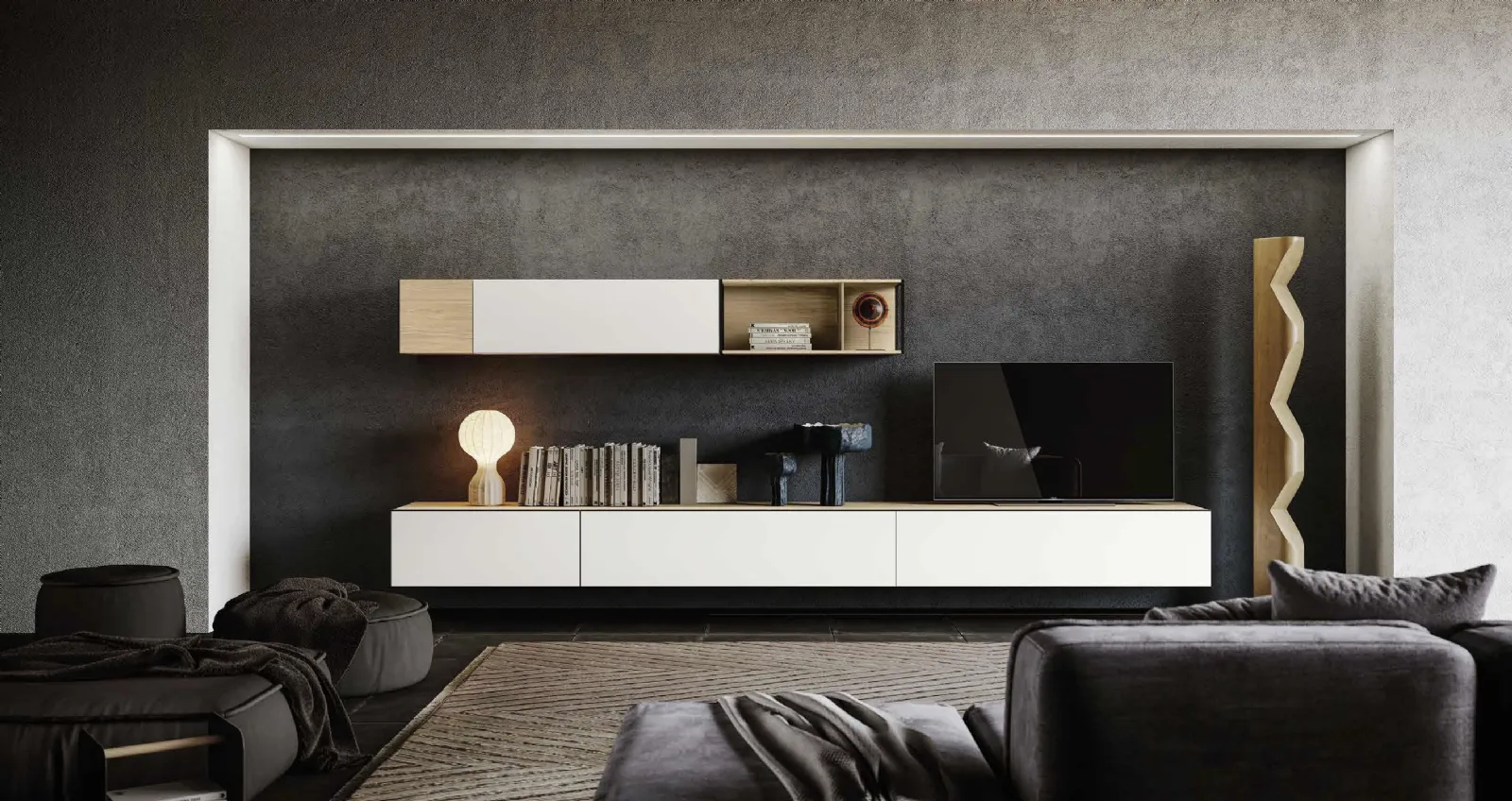 Il modello visibile in foto è realizzato in melaminico ma grazie ad una vasta scelta di texture, tonalità e forme potrà adattarsi a spazi di ogni genere secondo le più particolari esigenze abitative. Per informazioni e preventivi sulla Parete Attrezzata Mito QMC013 di Imab nella fotografia contattaci e trova le più originali proposte di soggiorni della marca. Ultimamente le Pareti Attrezzate hanno assunto un posto fondamentale in fatto di Arredamento Casa, essendo mobili plurifunzionali e salvaspazio realizzabili su misura. Attraverso un gioco dinamico e operativo di incastri, sovrapposizioni, accessori a giorno o vani chiusi, le Pareti Attrezzate moderne arredano il soggiorno valorizzando ogni spazio.