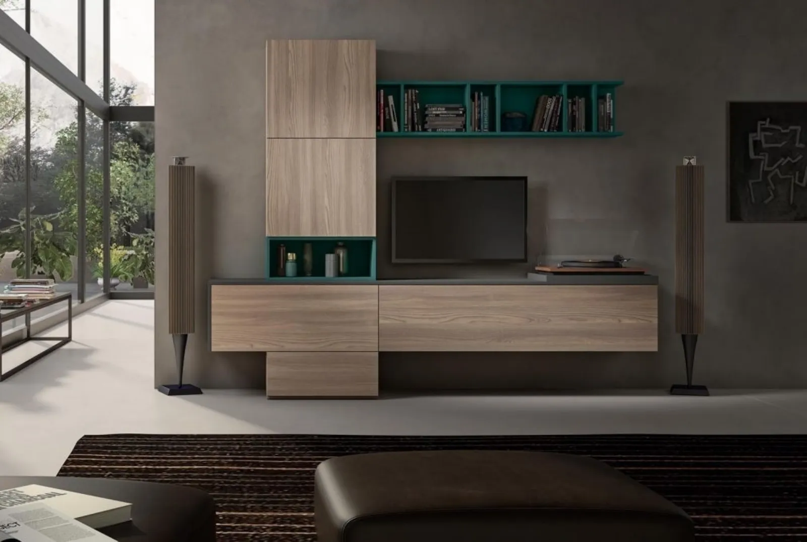 Nell'immagine qui sotto è rappresentata la Parete Attrezzata GF1085 Abitare Mobilstella, realizzata in melaminico e disponibile in una vasta gamma di tonalità e finiture.