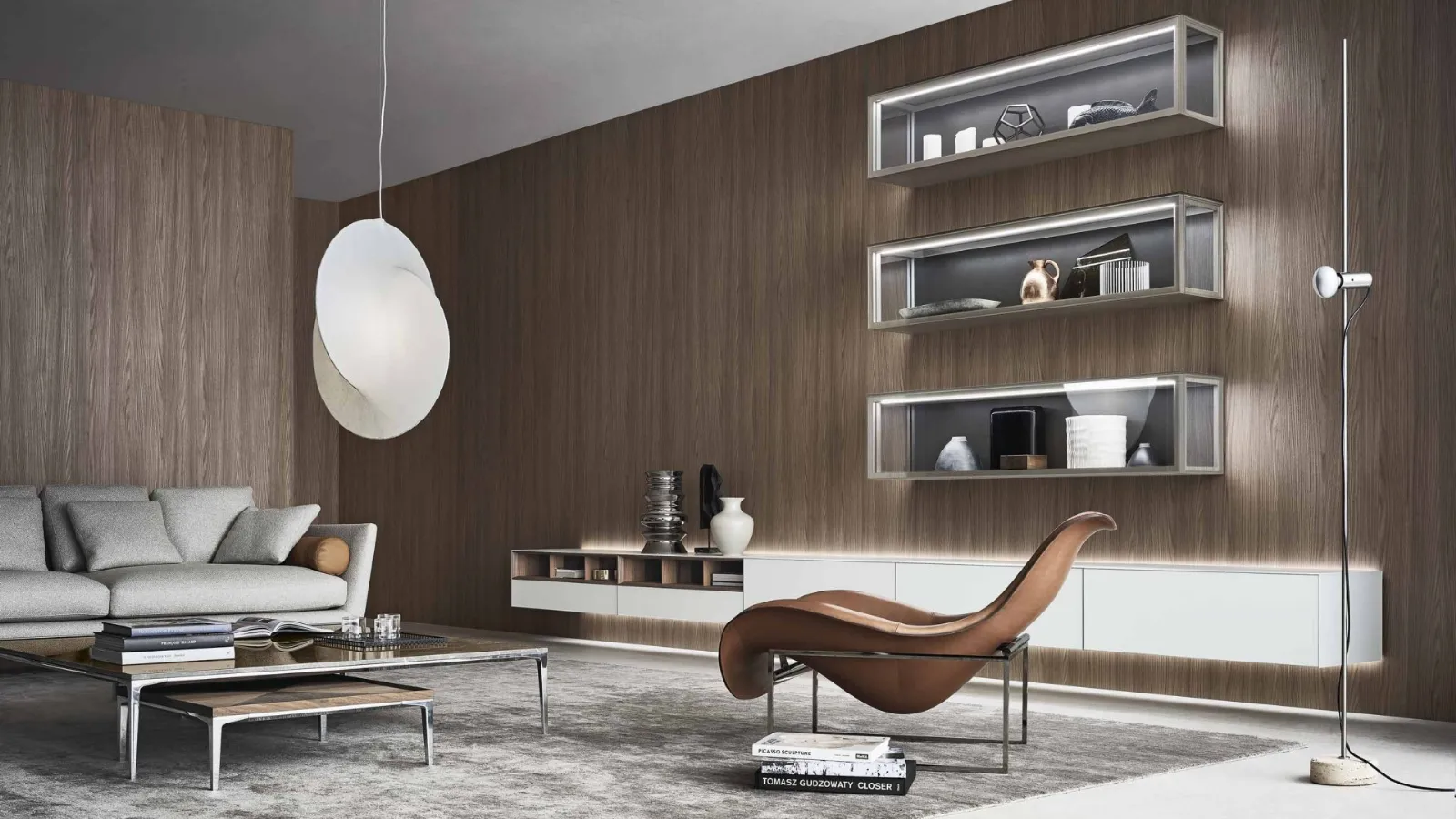 Scopri la parete attrezzata Self Bianco Latte in vetro di Rimadesio e valorizza la tua zona giorno.