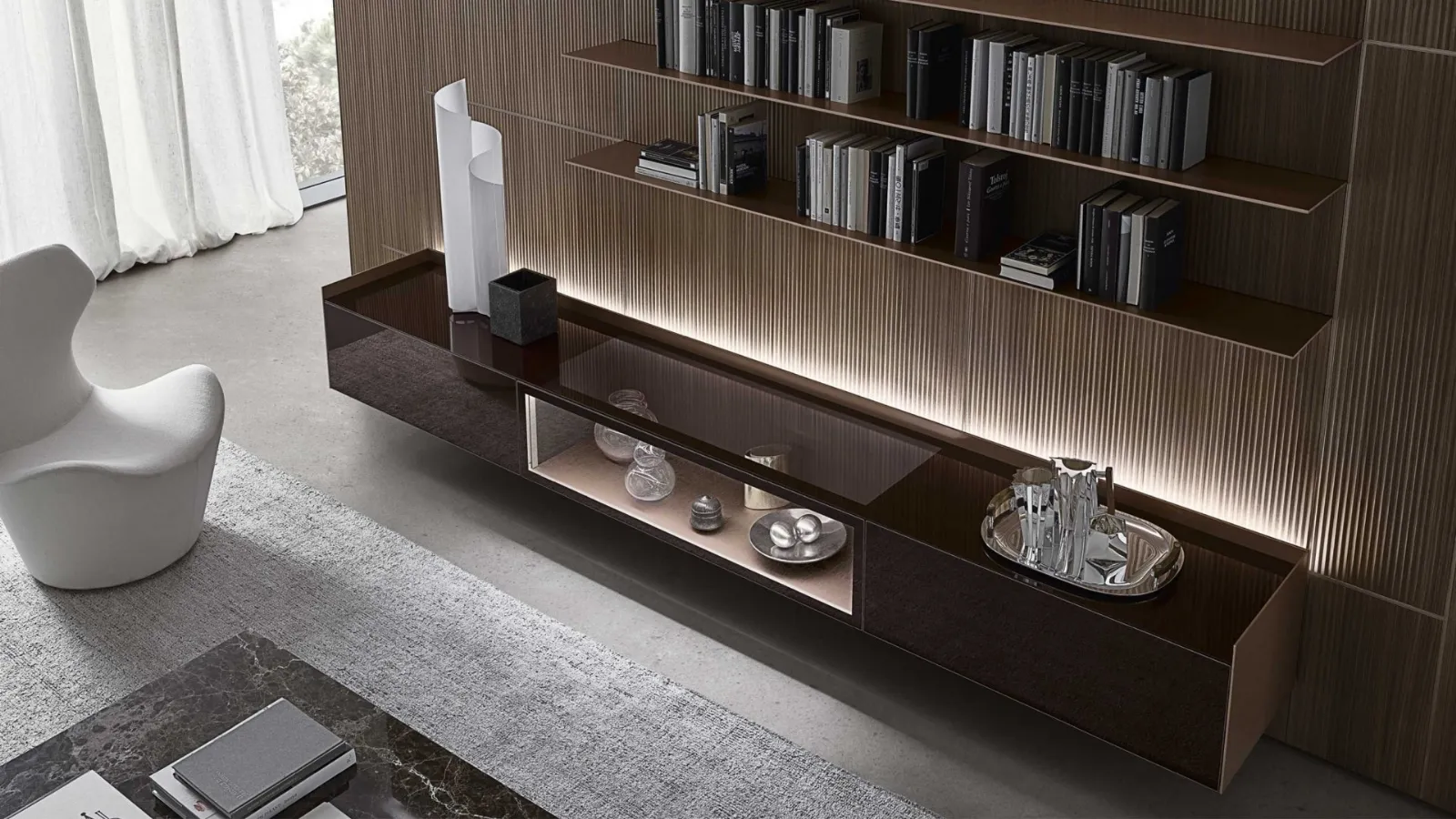 Ultimamente le Pareti Attrezzate hanno conquistato un posto importante in fatto di Arredamento Casa, essendo arredi multifunzionali e salvaspazio realizzabili su misura. Il modello visibile in foto è realizzato in vetro ma grazie ad una grande varietà di finiture, cromie e forme potrà adattarsi a spazi di ogni tipo seguendo le più personali esigenze abitative. Attraverso un gioco dinamico e operativo di incastri, sovrapposizioni, accessori a giorno o vani chiusi, le Pareti Attrezzate moderne arredano il soggiorno sfruttando bene ogni spazio.
