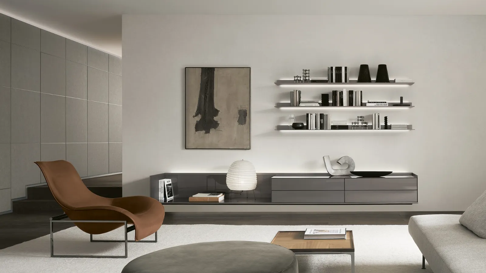 Lasciati stuzzicare da un ricco catalogo di arredi per la zona giorno e troverai la Parete Attrezzata che fa al caso tuo. I mobili soggiorno in vetro dalle linee moderne come il modello presente in foto sono veramente eclettici e capaci di allestire la zona giorno ottimizzando ogni angolo. Rimadesio mette a disposizione inediti modelli di Pareti Attrezzate, diverse per stile e conformazioni, texture e componenti: scopri l'Arredamento Casa del brand. La Parete Attrezzata sospesa Self Plan Peltro di Rimadesio nella fotografia è una tra le più belle soluzioni d’arredo in commercio: massima componibilità e le differenti possibilità di progettazione la rendono bella e di grande qualità. Questa parete attrezzata offre numerosi vantaggi: