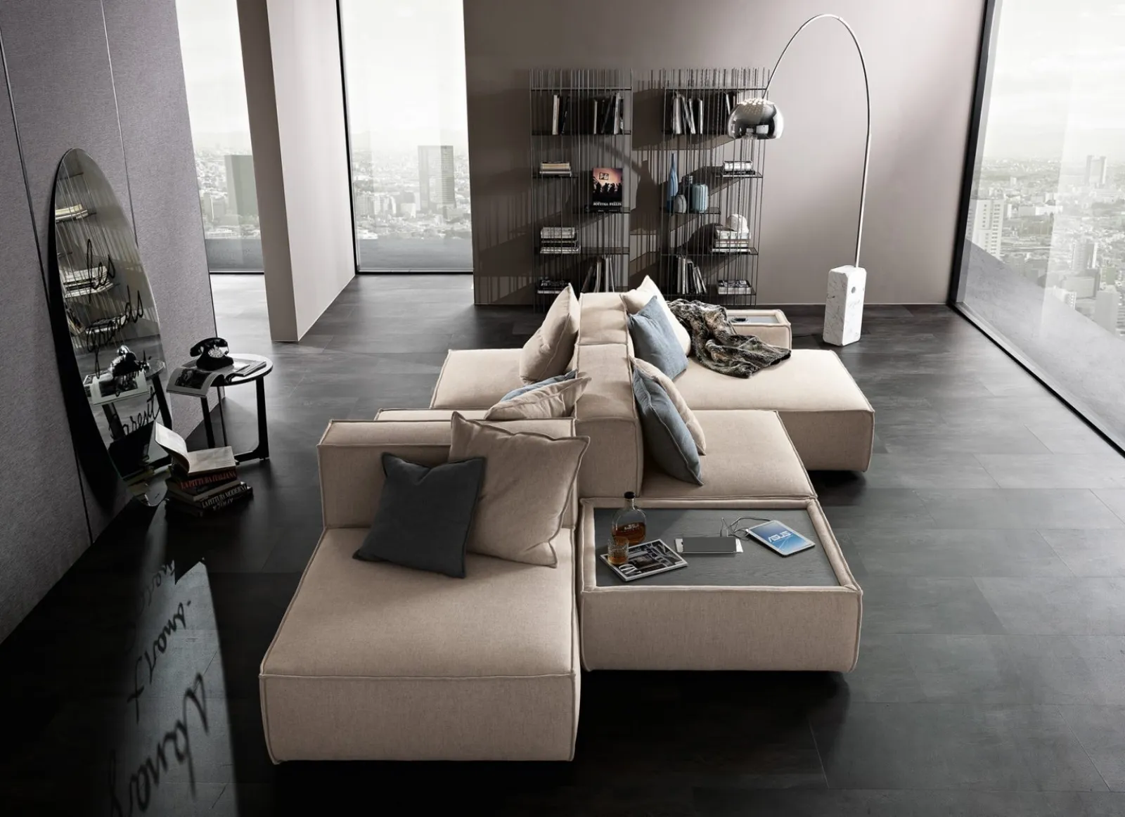 Se desideri imbottiti con penisola come il modello nella fotografia, contraddistinto dalle forme decise e dai volumi che invitano a passare i tuoi momenti di riposo. I Salotti della marca sono progettati per essere abbinati a elementi accessori di ogni genere, come tavolini, lampade e piantane o in combinazione con ulteriori divani in tessuto. Contattaci per trovare divani e poltrone di grande qualità, per informazioni e preventivi su questo salotto e su un ricco catalogo di divani anche realizzabili su misura. Divano bifacciale Oasi di Albani: ricrea uno spazio familiare e confortevole in spazi moderni dall'estetica raffinata.