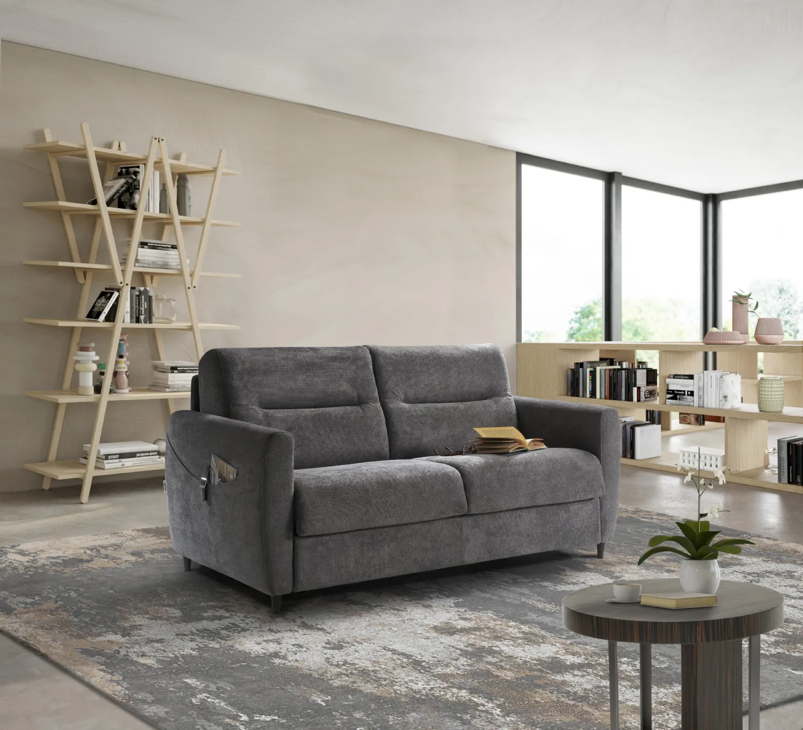 - Divano Letto Roger di Il Benessere, un modello ricercato ed elegante con rivestimento in tessuto.