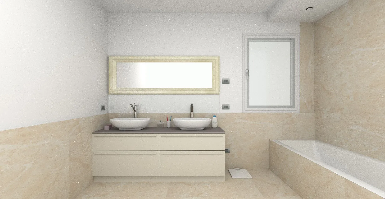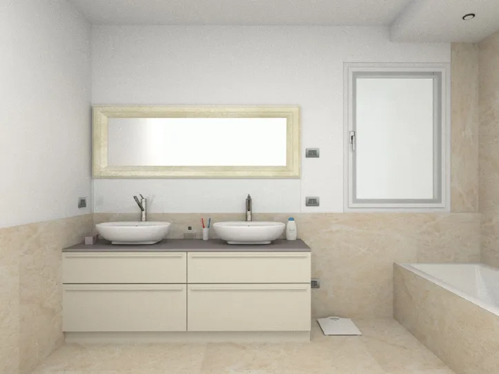 Bagno laccato canapa con doppio lavabo in appoggio in ceramica e top in quarzo. Realizzato ad Oderzo (TV).
