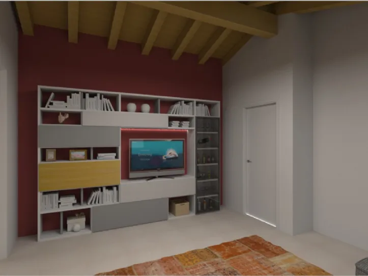 Parete soggiorno studiata su misura con spazio TV in zona centrale. Volutamente senza schienali negli elementi a giorno, per valorizzare il colore della parete. Realizzata in zona a Carbonera (TV):