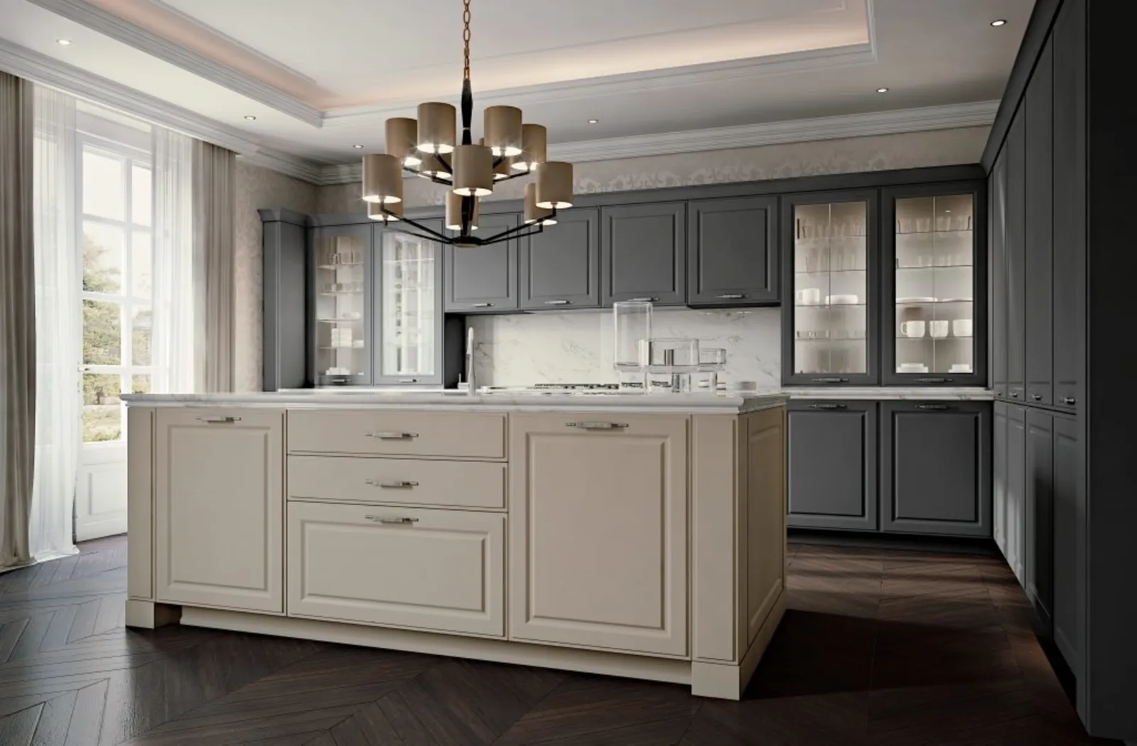 Scopri la cucina di gusto classico Gonzaga 02 di Scic: una composizione con isola in laccato opaco per cucine classiche.
