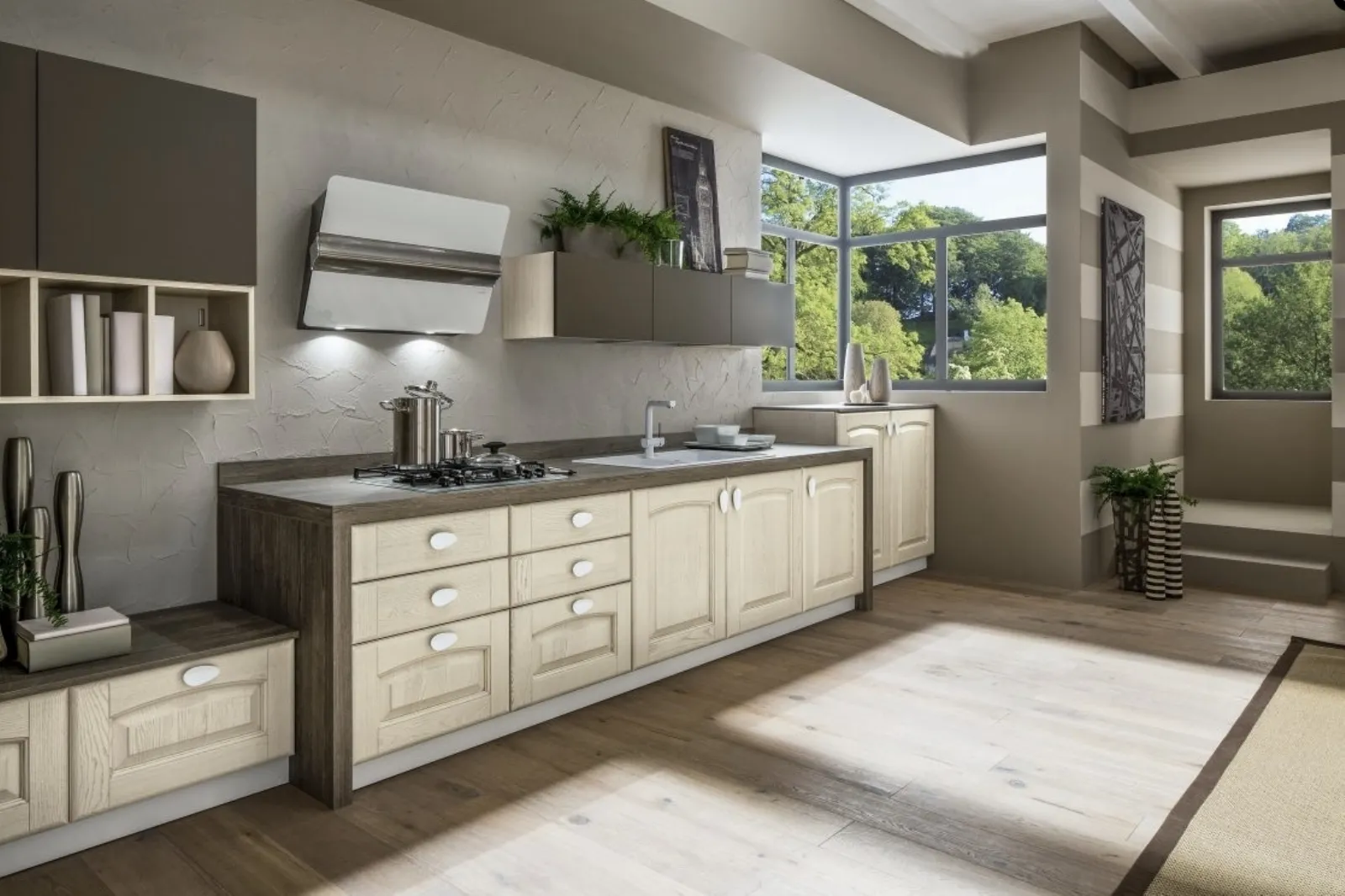 Scopri la cucina di gusto classico Magda Decape Gesso di Arrex: una composizione in linea in legno per cucine classiche.