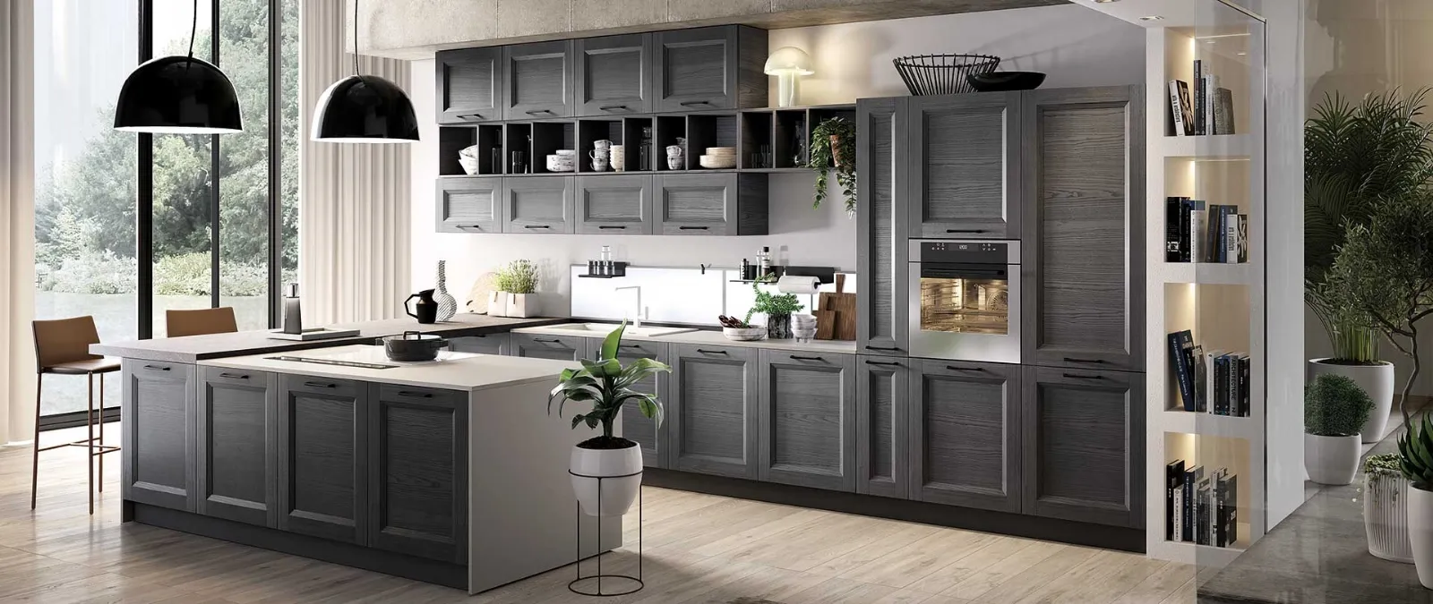 Scopri la cucina moderna Evo Cucine con penisola Gea Ardesia: una delle più esclusive proposte in legno per le cucine moderne.