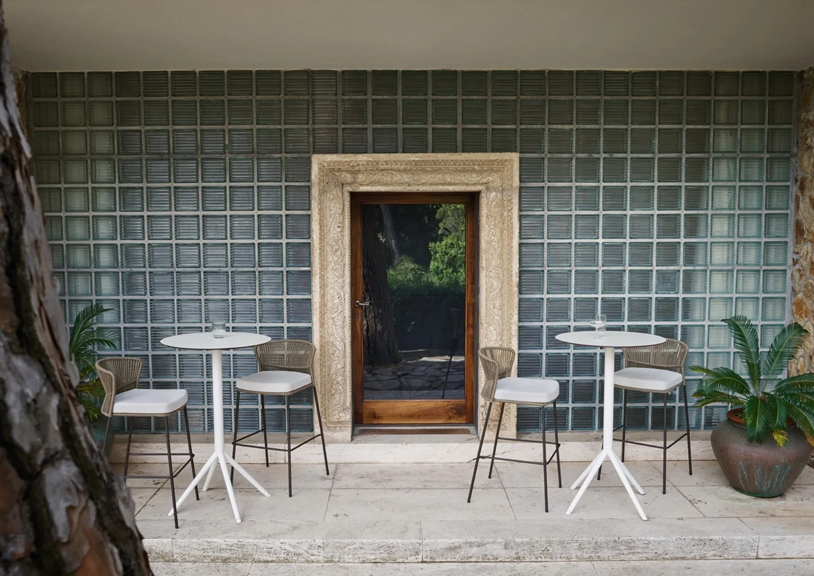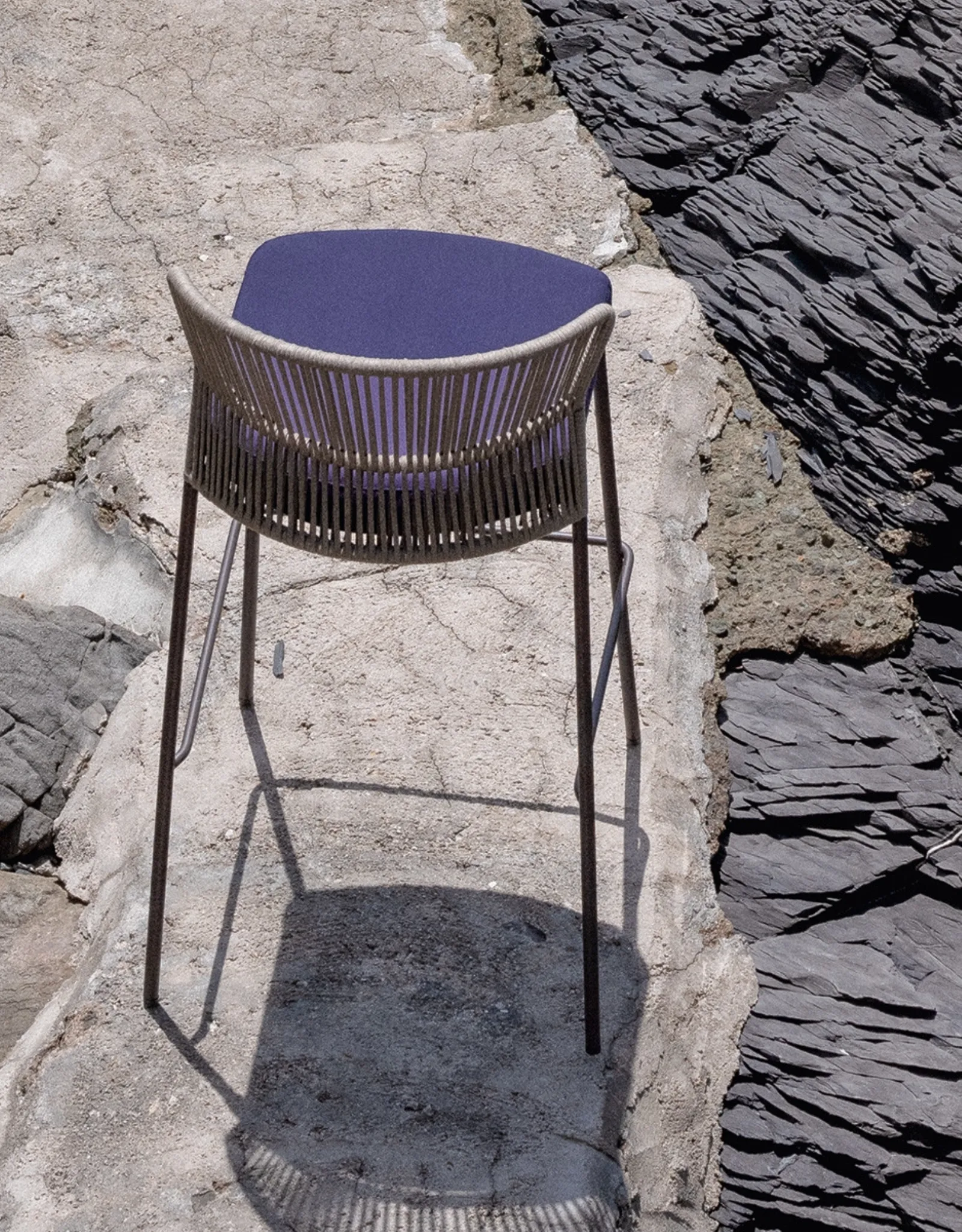Ai mobili e complementi per lo spazio esterno in metallo dell'azienda Potocco non mancano forme decise e grandi doti di praticità, come dimostra la serie di sgabelli da giardino nella fotografia: