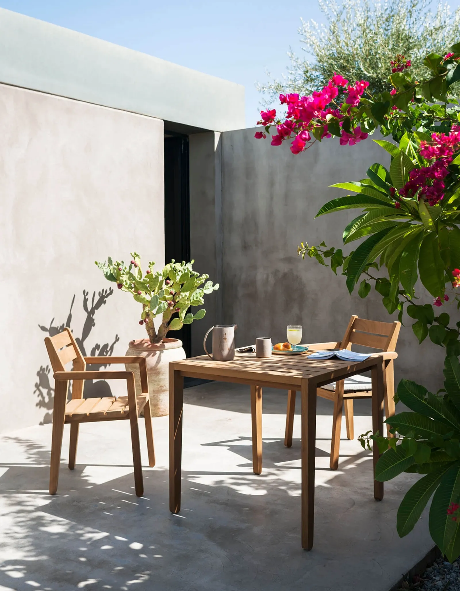 I mobili e complementi per il giardino in legno della firma garantiscono forme decise e grandi doti di funzionalità, come rivela la linea di tavolini da giardino nella fotografia.