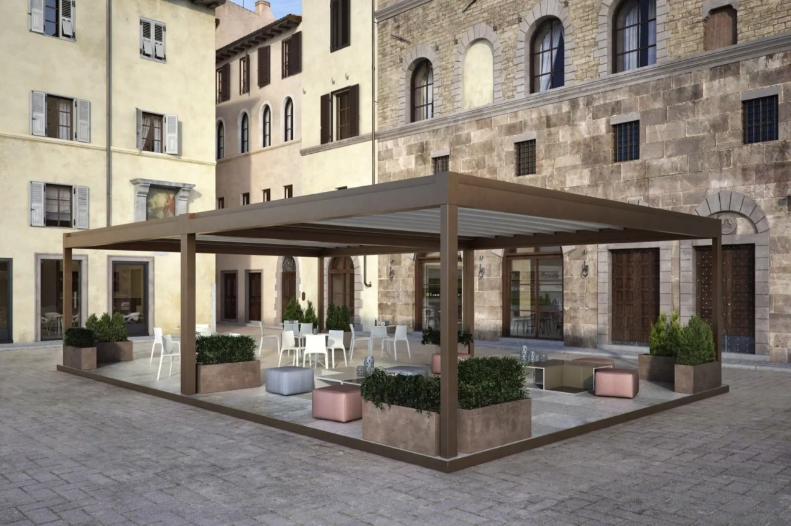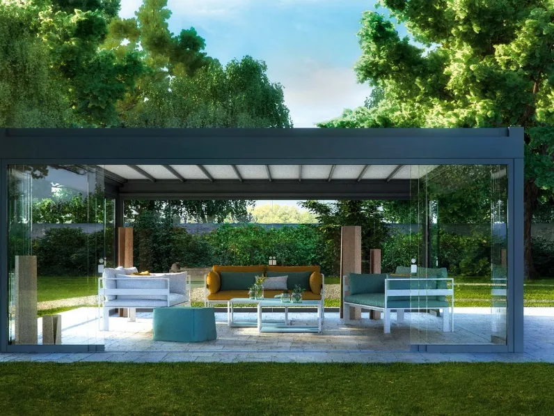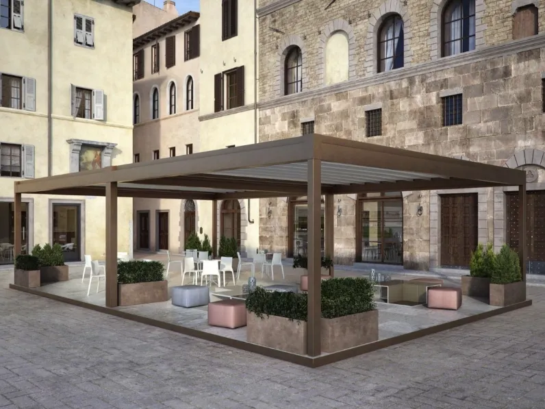Pergola dalle linee decise modello Rialto di Pratic: scopri una ricca gamma di arredo per lo spazio all'aperto
