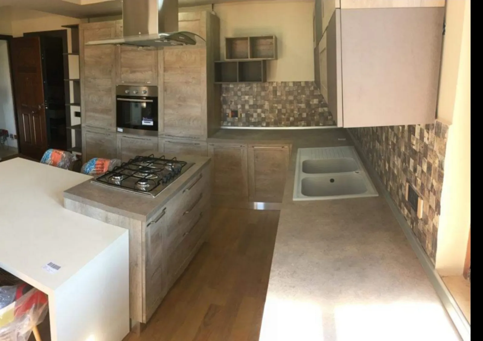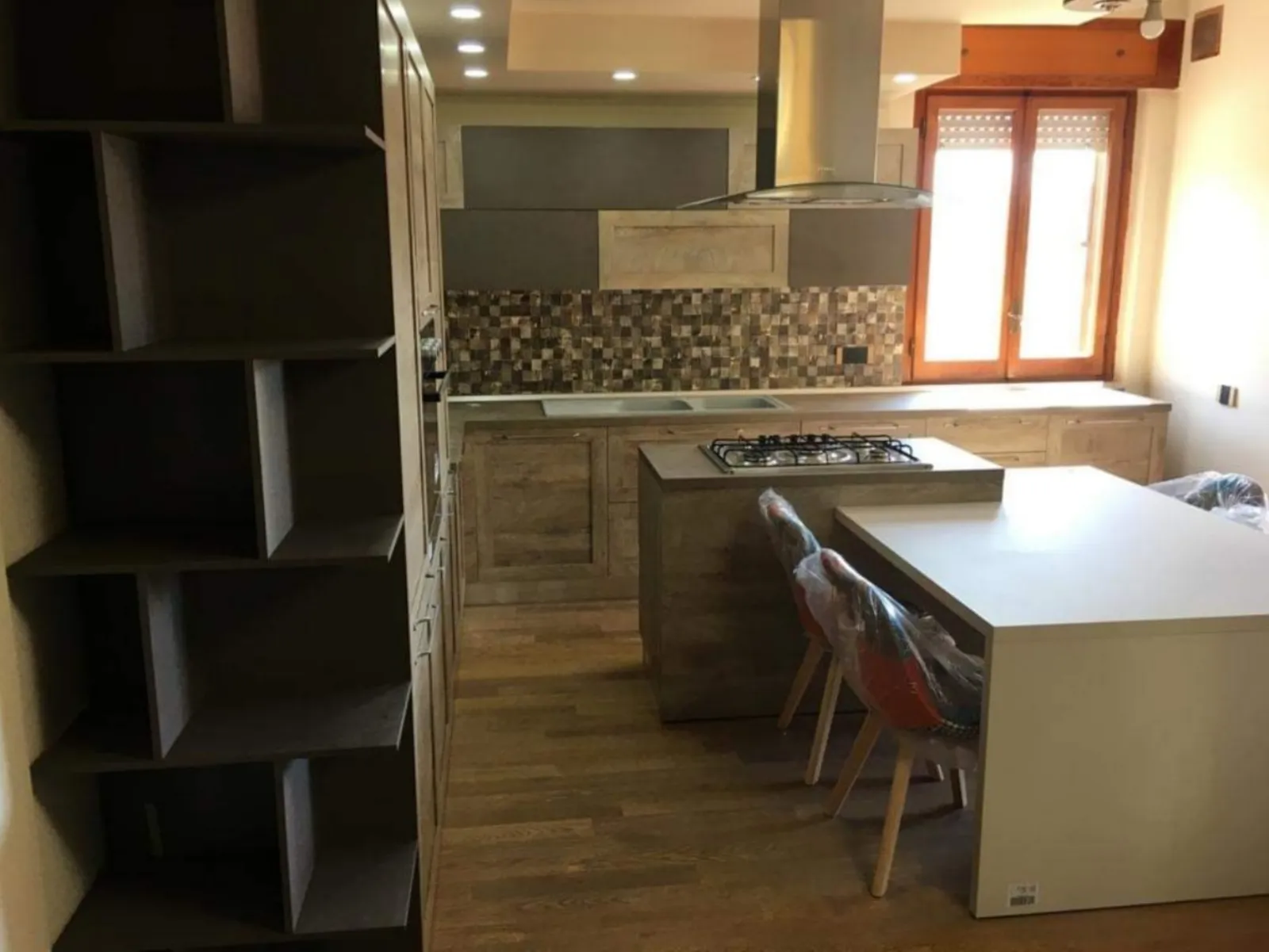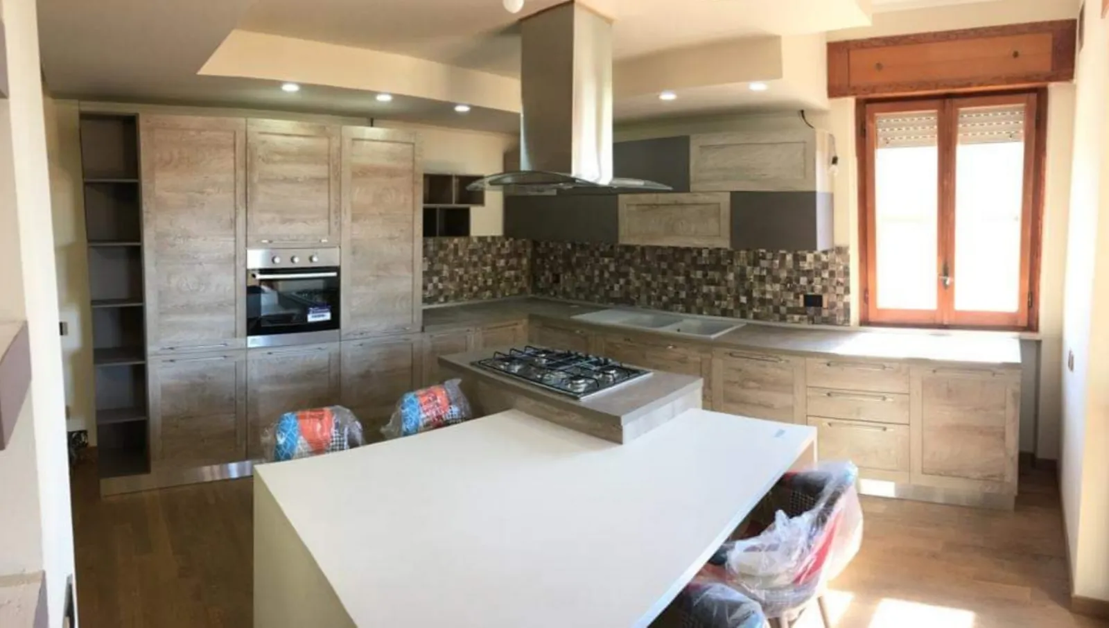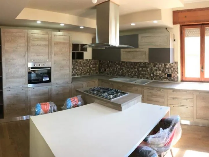 Cucina moderna a telaio del gruppo Imab, prestigiosa ditta italiana. La cucina è caratterizzata da un'anta a telaio, colore quercia. La cucina angolare è stata progettata su misura per il nostro cliente, che voleva un ampio piano di lavoro (top in fenix sp. 4 cm), progettato sotto la finestra in modo da usufruire della luce naturale, ma anche molti spazi a dispensa sia nelle colonne che nei pensili. La composizione si caratterizza da una splendida isola centrale, con cappa sospesa in acciaio inox e vetro, affiancata da un tavolo fuori misura in laccato bianco con quattro comode poltroncine di "La Seggiola" in tessuto color patchwork e gamba in legno, che colorano e modernizzano la cucina di questa graziosa villa in Toscana.