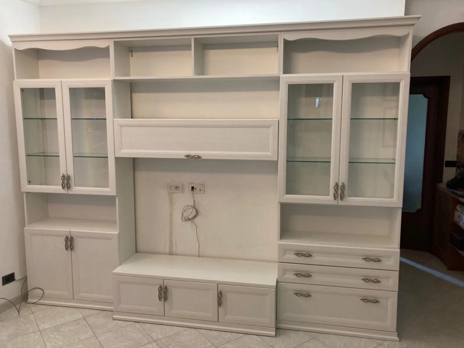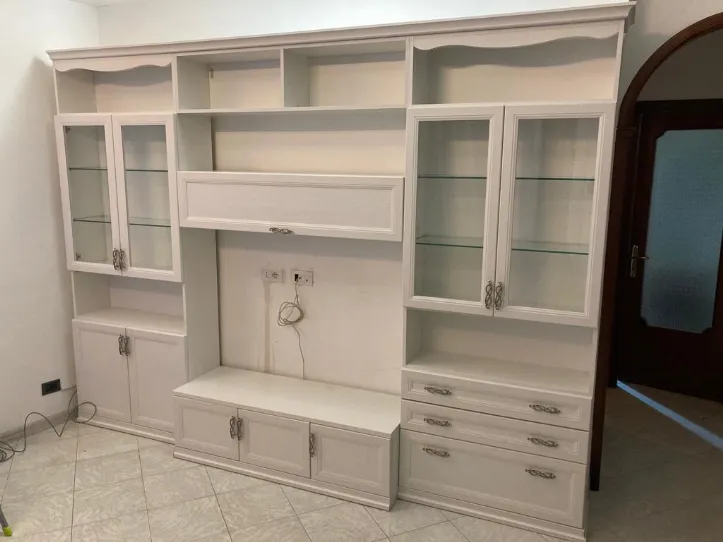 In un contesto nelle campagne romane abbiamo progettato per una nostra cliente una elegante parete attrezzata che riprendesse lo stile classico del resto dell'abitazione. Eleganti vetrine con ripiani in vetro a destra e sinistra delimitano la composizione, mentre al centro è lasciato lo spazio per il vano tv con soprastante pensile a vasistas. Tutta la parte superiore è adibita a libreria. La parte bassa della composizione è invece funzionale e contenitiva con alternanza tra ante, cassetti e cestoni. Questa composizione dell'azienda Colombini è decorata con una elegante cornice superiore ed uno zoccolo sagomato a terra. Anche le maniglie intrecciate effetto argento antico richiamano l'eleganza della classicità.